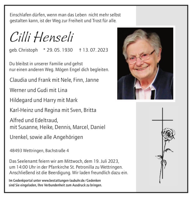 Liebe Familie Henseli. Der Tod Ihrer Mutter, Schwiegermutter und Oma hat mich sehr betroffen gemacht. Ich war ihre Nachbarin als ich noch ein Kind war und später. Ich habe ihr gerne zu gesehen wenn sie gekocht und Nudeln gemacht hat. Leider ging es ihr in der letzten Zeit nicht mehr so gut. Jetzt hat sie hoffentlich ihren letzten Weg in Ruhe machen koennen. Ich wuesche der ganzen Familie alles Gute.
