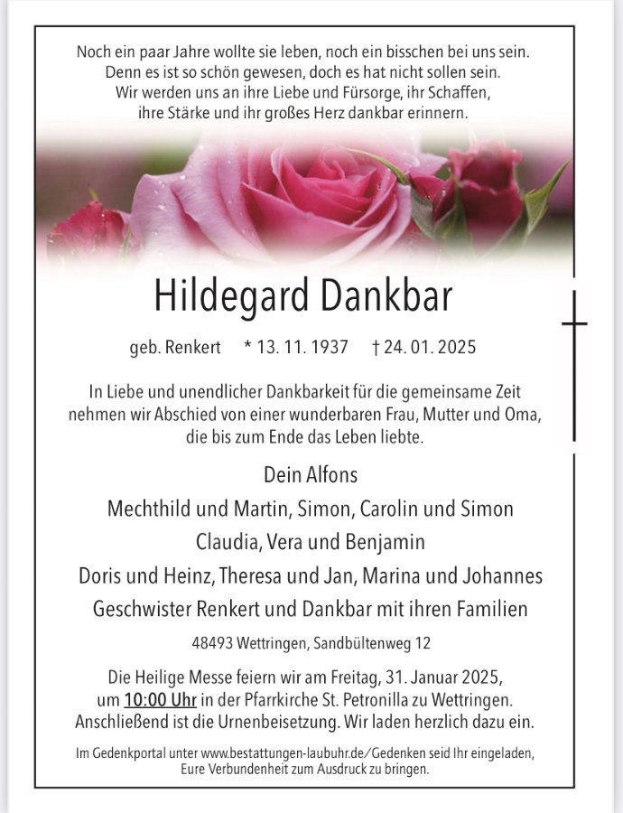 Hildegard war immer ansteckend gut gelaunt. Umso mehr ist Trauer angesagt. Das ist schwer. Vertraut auf Gott in Christus und auf ein Wiedersehn