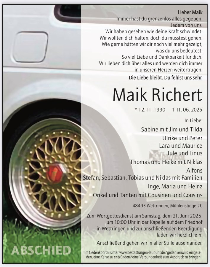 Wir wünschen euch und seiner Familie viel Kraft für die Zeit der Trauer und viele schöne Gedanken an Maik, die ihn an eure Seite bringen.