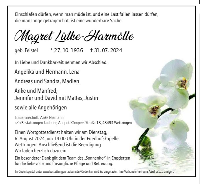 in Verbundenheit und Anteilnahme möchten wir euch einen lieben Gruß senden. Haltet eure Mama und Schwiegermutter im Herzen.