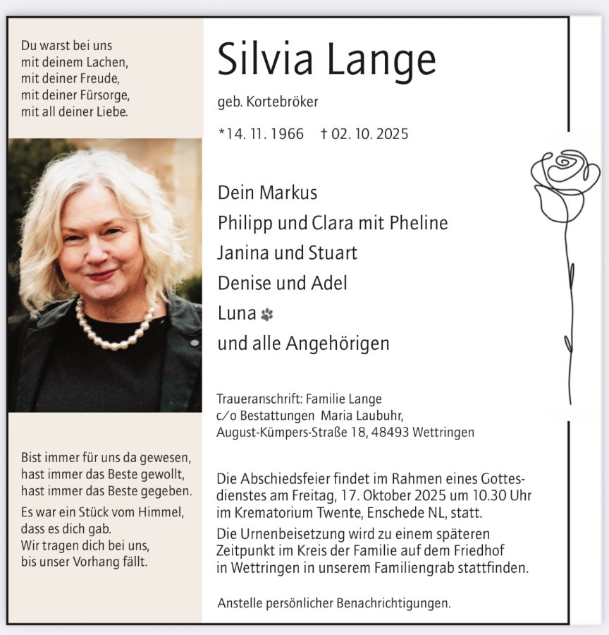 Wir wünschen euch ganz viel Kraft für die Zeit der Trauer. Silvia wird weiter bei euch sein. In eurem Herzen und in eurer Erinnerung.